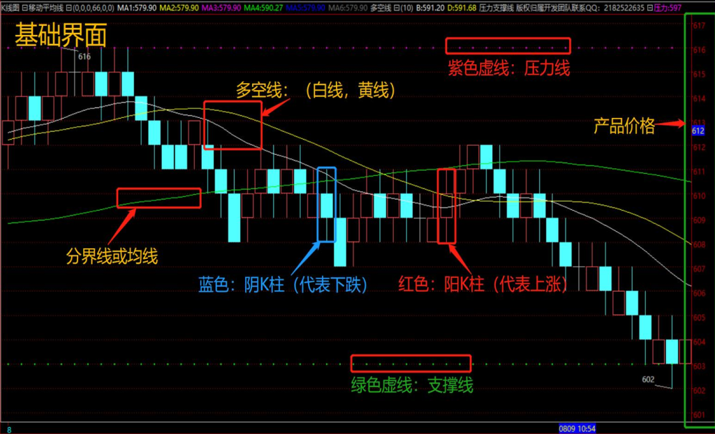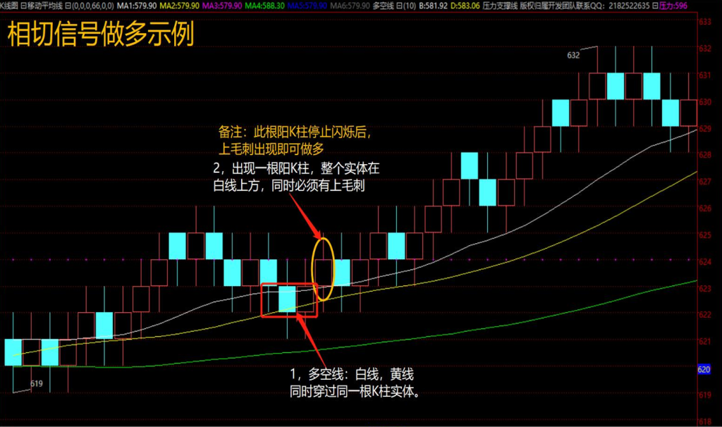 - 多空线:白线,黄线同时穿过同一根K线实体。