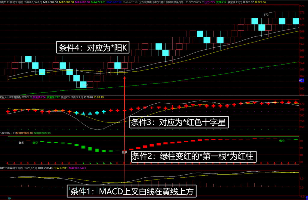 - 条件4:多空线 白线在黄线上面,且为阳K