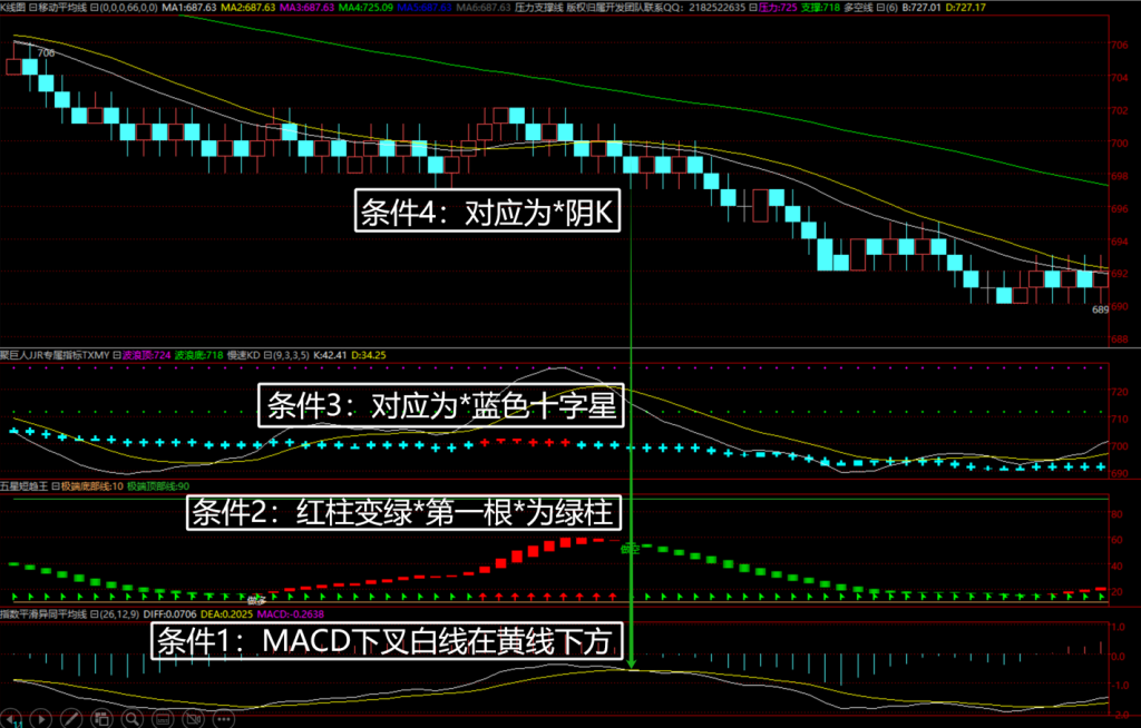 - K线必须是阴K,且有下引线,同时,必须是上引线对应交叉点;
