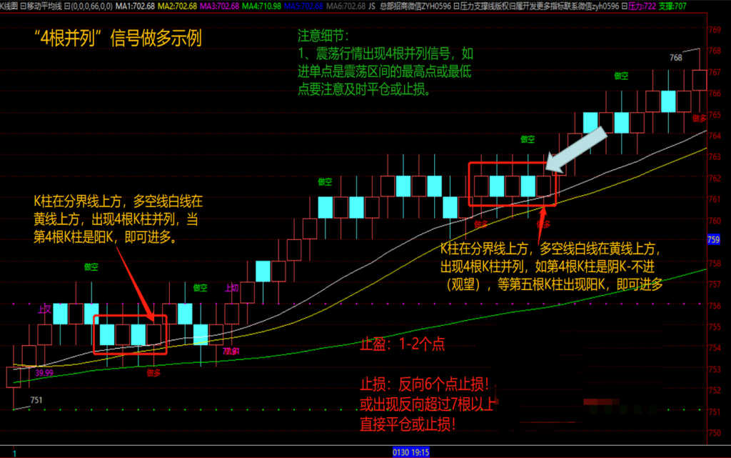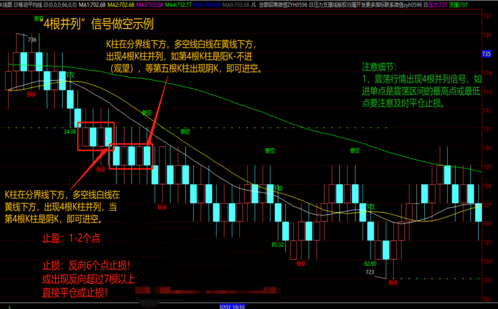注意:震荡行情出现4根并列信号,如果进单点是震荡区间的最高点或最低点,要注意及时平仓或止损。