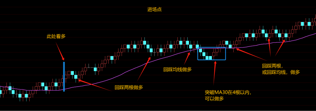 - 进场点:1,K线回踩均线;2,当K线稍微有点突破30均线,或者突破在4根以内。都是做多的进场点。